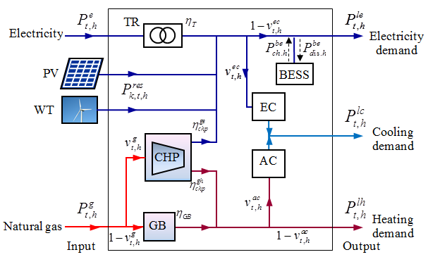 In this new context, the structure of traditional energy supply systems that is mainly responsible for generation, transmission and management of an energy carrier has significant changes. The various types of EH structures are summarized and introduced in studies (Mohammadi et al., 2017) that the simplest type is similar to traditional energy supply systems with correlates consumer and producers of energy together through conversions and storage systems. The most widely used structures of EH in the literature consist of a transformer (TR), combined heat and power (CHP), boiler, and storages which can convert between the input energy types and/or loads. In such a structure, a particular demand can be met in various ways and thus the flexibility and reliability in the supply of EH increase because of increasing the degree of freedom in supply and demand, and more flexible maintenance of different components.