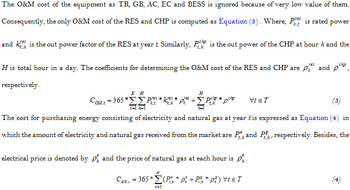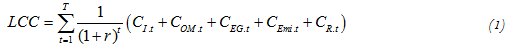 Where, CI.t is the investment cost and COM.t is the O&M of the equipment at year t. CEG.t is the cost of energy purchase (electricity and natural gas) from the market. CEmi.t is emission cost of the sources in the EH and CR.t is replacement cost or residual value of the equipment at the end of the project. r is discount rate and T is total planning time.