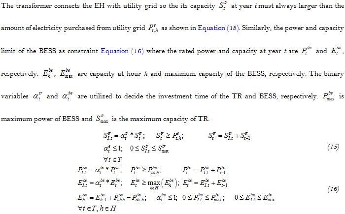 The cases study has illustrated the feasibility of the proposed model and effectiveness of RES and BESS. However, the future works on the planning of EH can consider to discrete parameters as rated power and capacity of equipment to enhance the practical application of EH.