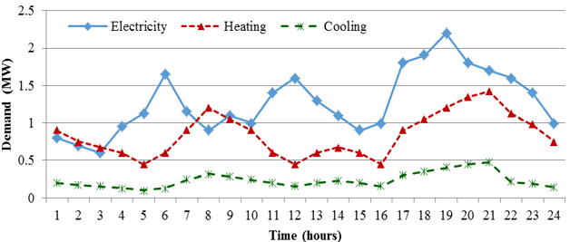 Figure-2. Electricity, heating and cooling demands at 24h, a day.