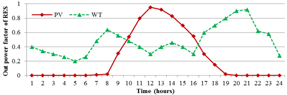 The typical daily curves of loads at base year are assumed as Figure 2 where the growth of electrical, heating and cooling demand are about 5%, 2.5% and 1% annually, respectively. Similarly, the average out power of RES at 24 hours each day is also assumed and represented in Figure 3.