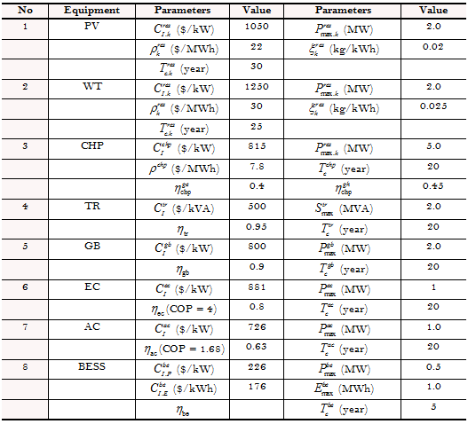 The computed parameters of equipment are assumed as Table 2. In addition, the CO2 emission coefficient of electricity from the utility source and natural gas are about 0.623 kg/kWh and 0.184 kg/kWh, respectively. The CO2 emission tax probably enforced by the government is 4.12 $/ton (Deng et al., 2017; Wanga et al., 2017). The simulation period is 5 years and the discount rate is 10%.