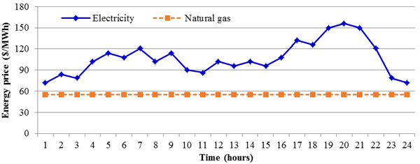 Recent, the electricity prices often vary largely in day cycle depending on the market. In this study, the typical daily curve of electricity price is shown in Figure 4. In contrast, the gas prices changed a little in the short term so in a typical day it is an instant and is about 0.055 $/kWh (Pazouki and Haghifam, 2016; Wanga et al., 2017; Bayod-Rújula et al., 2018).