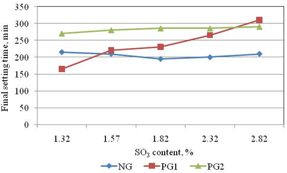 Generally, the setting times of the cement increase when PG content in cement increases. But changing NG content in range of this study does not change both the setting times Table 4 and Figure 2, 3. For PG1, the initial and final setting times of cement containing 3.24% PG1 (1.32% SO3) are 85 and 165 min, clearly shorter than those of cement containing NG and PG2, respectively. However, the setting times of the sample containing 6.9% PG1 (2.82% SO3) increase up to 205 and 310 min, significantly exceed those of the samples containing NG or PG2. The cement containing 3.35% PG2 (1.32% SO3) possesses the initial and final setting times of 135 and 270 min, respectively. When PG2 increases from 3.35% (1.32% SO3) to 7.2% (2.82% SO3), both the setting times of cement increase only 20 minutes Table 4.