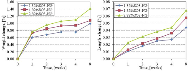 Comparing the results of the samples at the same SO3 content between different gypsums (i.e. NG, PG1 and PG2 in Figure 7 to Figure 9) indicates that there is no significant difference in weight change between the three gypsums. The expansion of the samples containing PG1 is largest Figure 8. The samples containing low contents of NG (i.e. 1.32% and 1.82% SO3) have the length change slightly higher than the samples containing low contents of PG2, respectively. Meanwhile, the length change of the sample containing high content of NG (i.e. 2.82% SO3) is lower than that of the sample containing high content of PG2.