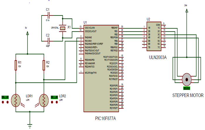 The tracking of the sun is achieved by coupling a stepper motor to the PV panel to track the sun position as it rotates thereby producing maximum energy. This is achieved by using a programmed microcontroller to deliver stepped pulses in periodical time intervals (Shaifali & Jain, 2014). This causes the stepper motor to rotate the mounted panel as desired. In principle, microcontroller based solar tracker consists of light dependent resistors (LDRs), microcontroller, motor, solar panel, battery and power supply. LDRs are used to sense the light intensity and locate the position of the sun relative to the panel. The microcontroller receives data from LDRs, computes the data and signals the motors to align the panel.