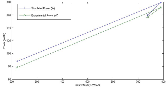 Figure-6. Effect of solar irradiance on the output power of solar PV module during simulation and experimentation.