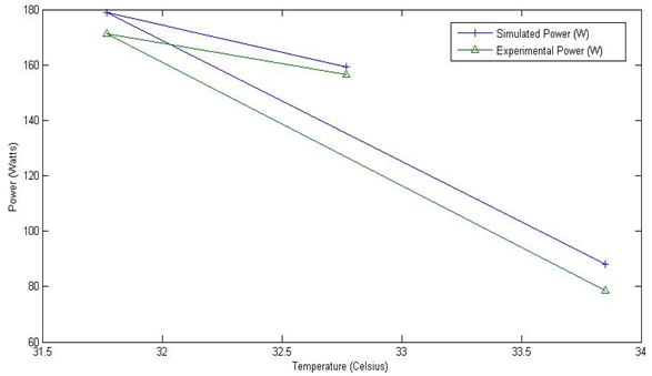 Figure-7. Effect of cell temperature on the output power of solar PV module during simulation and experimentation.