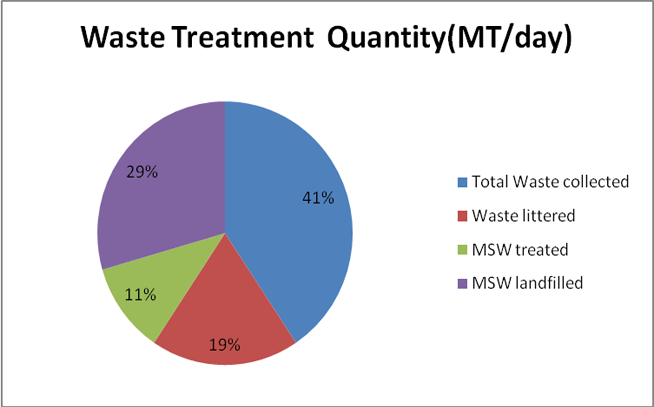 The traditional solid waste management processes, such as composting, bio-methanation and land filling, suffer from the disadvantage of environmental deterioration and space problem, as composting and bio-methanation requires large area for treatment and it takes long period of time. For land disposal of solid waste, India needs 1,240 hectares of extra valuable land every year to include untreated solid waste. As per report published by Ministry of Urban Development, government of India, 2014, Solid waste produced was 133000 MT/day, Total waste collected is 91000 MT/day, waste littered 42000 MT/day, from the collected MSW 26000MT/day is treated and 66000 lakh MT/day landfilled (crude dumping). The waste generated is 133000 MT/day and waste collected, treated , littered and land filled has been shown in Figure 3.