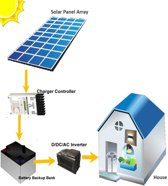 Off-grid systems include the main components of panels, batteries, controllers, and inverters (Li, Li, Zhu, & Ma, 2021). Solar modules produce direct current power. DC (direct current) power is channeled by the charge controller and charges the battery. The controller has dual functions to perform; one is to charge the battery, and the second is to prevent overcharging. Other accessories like cables are also required, which need to be ultraviolet safe and sensible for open-air applications (Kumar, Rajoria, Sharma, & Suhag, 2021). These systems are designed to meet daily needs and have sufficient battery capacity to supply power at night or on cloudy days (Spea & Khattab, 2019). Figure 2 shows an Off-Grid system.