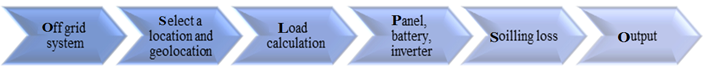 The simulation steps in the software are summarized in Figure 3. According to this Figure, in the first step, the off Grid system is determined according to the geographical and technical conditions, and then the factors affecting the system efficiency are examined.