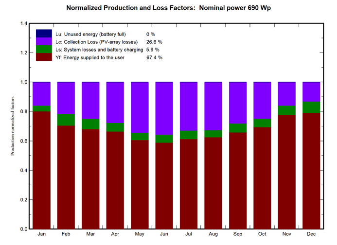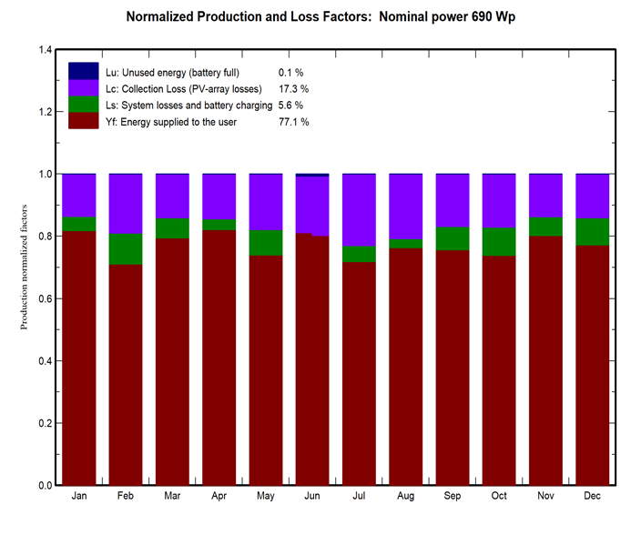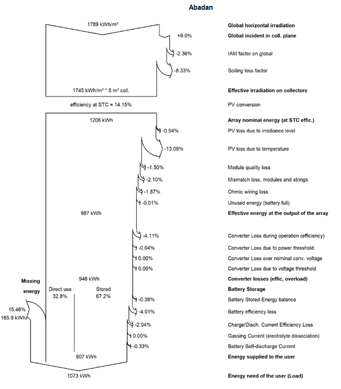 Abadan is one of the tropical regions in Iran and experiences several sand and dust storms annually. Due to the climatic conditions of this city, high temperature combined with dust affects the performance of solar systems and significantly reduces the output power. Figure 6. shows normalized production and loss factors. PV-array losses are 26.6%, and system losses are 5.9%. Most system losses occur from May to September because of the hot weather. For a year, different losses of the system for Abadan are seen in Figure 7. The GHI of the solar system is 1789 Kwh/m2. Also, the effective irradiance on the collectors is1745 Kwh/m2. The energy need of the user is 1073KWh. PV loss due to temperature is -13.09%, and soiling loss factor is -8.33%. Based on these results, it can be seen that the amount of losses due to temperature and dust greatly reduces the power and efficiency of the solar system. Therefore, using the solar system in this area is not efficient.