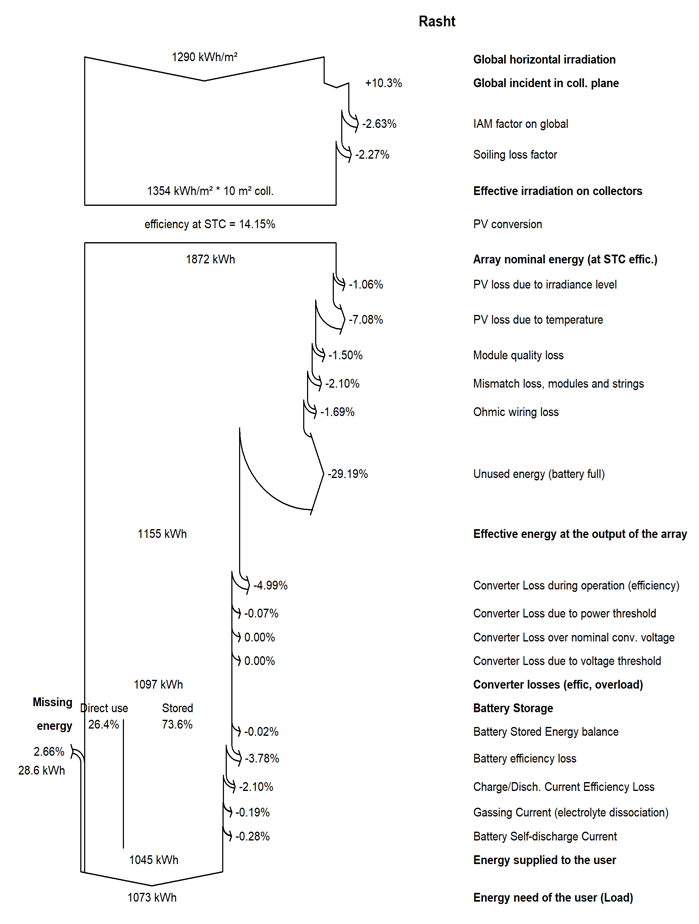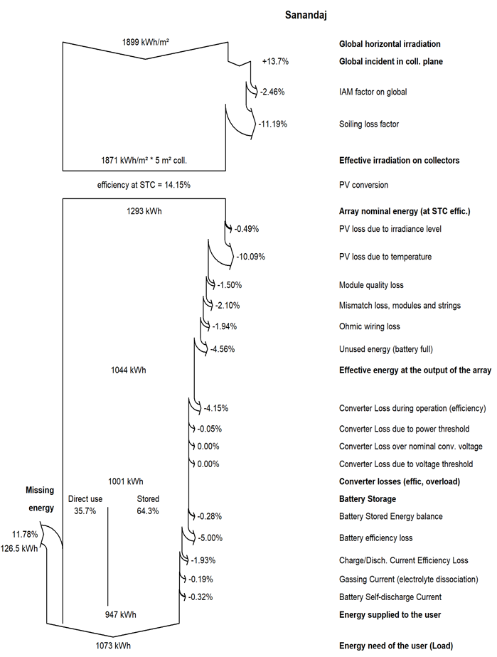 Due to its geographical location and cold and humid climate, Sanandaj has a significant number of snowy days, but the dust in the city air is low and insignificant. Normalized production and loss factors are shown in Figure 10. PV-array losses are 27.7%, and system losses are 6.4%. The energy supplied to the user is 63.5%. According to the Figure 11, most system losses occurred in February, mainly due to snowfall in the city. The amount of system losses in June is also significant, the most important reason being the ambient temperature. Like other cities for Sanandaj, the flow diagram for a whole year is shown in Figure 11. The GHI for this city is 1899 Kwh/m2. Also, the effective irradiance on the surface of panels is1871 Kwh/m2. The energy need of the user is 1073KWh. PV loss due to temperature is -10.09%, and soiling loss factor is -12.95%. Based on these results, it can be seen that snowfall in winter on the surface of the panels and the ambient temperature significantly reduce the efficiency of the solar system.