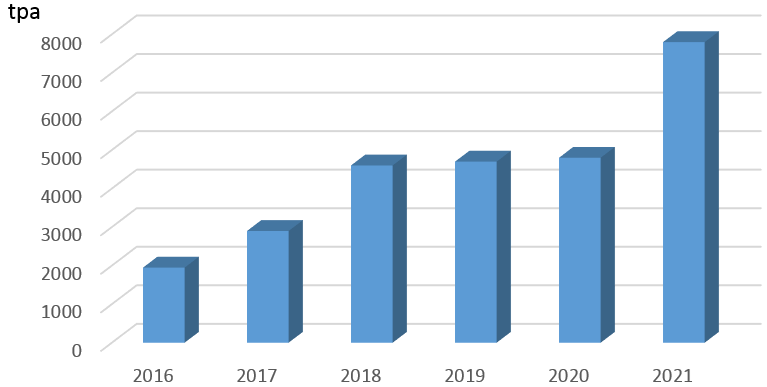 Despite having the disadvantage of high cost attributed to the dilute nature of CO2 gas in air which increases cost, the Direct Air Carbon Capture and Storage (DACCS) technology is now seriously been revisited as it offers the advantage of negative emissions. Although, the technology is still at infancy, it is projected that it can be used to achieve an annual amount of 980 million tonnes of CO2 capture by 2050, however current capacity stands at 8000 tonnes with nineteen projects coming onboard since 2010 (Hanak, 2022)  this seems a herculean task to achieve. The growth in the DACCS technology from 2015 to 2021 as sourced from the International Energy Agency  (IEA) is presented in Figure 4 .