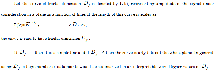 The fractal dimension (FD) is used to quantify the complexity and self-similarity of a signal [13]. FD analysis of EEG data has been applied in the biomedical research, such as the routine detection of dementia [14, 15] EEG analysis of sleeping newborns [16] and fractal spectral analysis of pre-epileptic seizures [17]. The use of FD in the analysis of EEG data was suggested by Popivanov, et al. [18]. Wahlund, et al. [19] proposed an approach where one looked at FD of the curve as the representation of EEG data obtained from ECT seizures to identify differences in responses between parts of the brain. In some other studies, estimation of FD of similar biological signal has been used. For the data used from magneto encephalogram (MEG), Gómez, et al. [20] estimated the complexity of those signals in Alzhemer’s patients and healthy elderly. They found significantly lower complexity of MEG in Alzheimer’s patients compared to the control subjects.