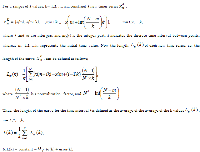 The value of kmin and kmax have to be chosen in advance. Finally, when is plotted against (1/k) on a double logarithmic scale, with k= 1,2,…,kmax, the data should exhibits a straight line, with a slope
