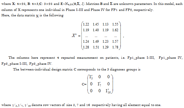 where X: p×n, B: p×k, C: k×n and E~Np,n(0,∑, I). MatricesB and∑ are unknown parameters. X is the data matrix; C is known between individual design matrix and the columns of E are independent and the dispersion of each column equal to S.