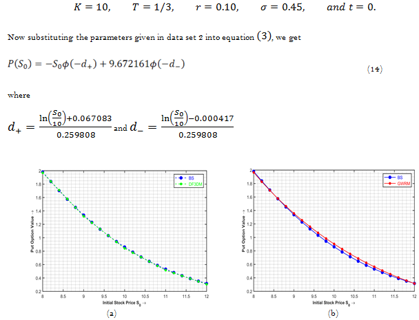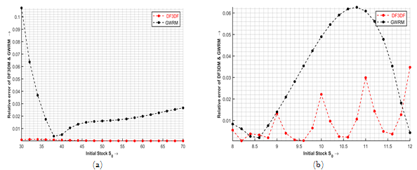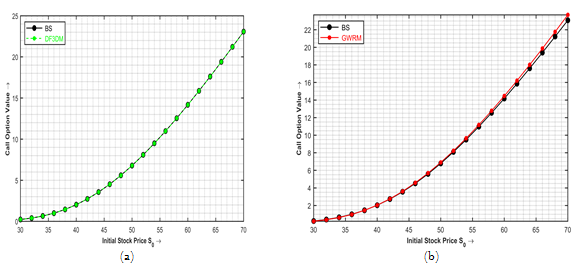 Figures 2 (a) and 3. (a) , shows that approximate option prices obtained by DF3DM, nearly equal to BS values for all initial stock prices and from Figures 2. (b) and 3. (b) we observe that when the initial stock price is greater than the strike price then the approximate values obtained by GWRM fluctuates slightly from the BS values.