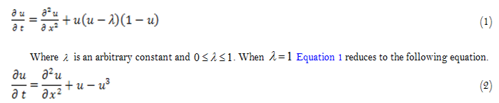 Equation 2 is the famous real Newell-Whitehead equation. The F-N Equation 1 has been studied by many mathematicians and physicists. In Shih, et al. [10] Shih applied approximate conditional symmetries method to obtain first-order approximate solutions of the perturbed FitzHugh-Nagumo equation. Abbasbandy [4] applied an analytic technique, the homotopy analysis approach to obtain the soliton solution of the F-N equation. Bhrawy [11] used Jacobi–Gauss–Lobatto collocation method for solving the generalized FitzHugh–Nagumo equation. The Haar wavelet method has been presented by Hariharan and Kannan [12] for solving the standard FitzHugh–Nagumo equation. Chen, et al. [13] presented semi-explicit finite-difference method for generalized Nagumo reaction-diffusion equation where Feng and Lin [14] used finite difference method to approximate traveling wave solutions of the FitzHugh-Nagumo equations. Van Gorder [15] exercised the variational method to obtain analytical solutions for both the Nagumo telegraph and the Nagumo reaction–diffusion partial differential equations. In Teodoro [16] Teodoro used finite element method for solving FitzHugh-Nagumo equation but the application was in linearized equation that was converted from nonlinear to linear by applying Newton method.