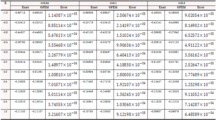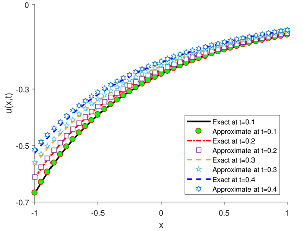 From Table 1 it is seen that our proposed method gives a good accuracy for different time circles. Figure 1 depicted the approximate and the analytical solutions for various time t. It is noted that for drawing Figures and computing table, we have used MATLAB R2017a code. From this diagram, visibly it is observed that the numerical solution almost coincides with the exact solution.