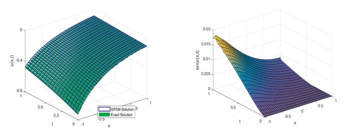 In Figure 2a, we show the three-dimensional view of the comparison between the exact and approximate solutions. But for the good agreement of the approximate solution to the exact solution, it is hard to distinguish. That is why we use a transparent graph for the approximate solution curve. For better understanding we also provide the error map over time and space domain in Figure 2b which shows a very good similarity with the exact solution, i.e. eventually the error tends to zero.