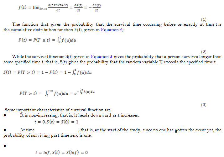 In survival analysis the function that gives the probability of the survival time occurring at exactly time t is the density function in Equation 1 ;