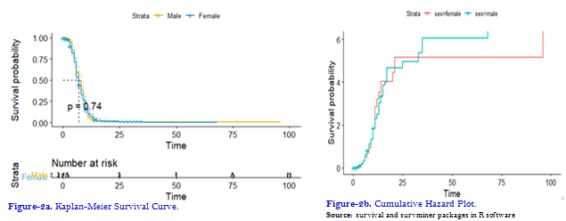 Based on the graph both male and female patients have the same probability of survival and the probability of survival is 0.74. The cumulative hazard plot also confirms that the survival time of both sex are similar.