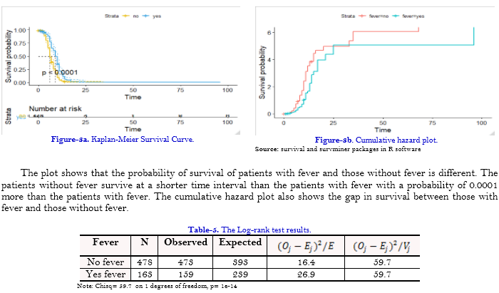 This test confirms what the graphs in Figure 4 & 5 shows, that there is a significant difference between the probability of survival for patients with fever and those without fever.