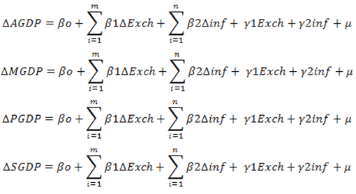 The theoretical foundation of this study was based on the Monetary Model of Exchange Rate. The research method employed is ex-post facto design. The study covered the period 1981-2016. Quantitative technique of data analysis was adopted in investigating the relationship between the dependent variable {agricultural output (AGDP), manufacturing output (MGDP), petroleum output (PGDP) and service sector output (SGDP) and the independent variables (exchange rate, inflation rate). Data for the study were obtained specifically from CBN statistical bulletin (2016). The model used in this study was adapted from the work of Ufoeze et al. (2018). In their model, GDP was the dependent variable while exchange rate, inflation rate, money supply and oil revenue were the explanatory variables. As a modification, this study disaggregated GDP into four component sectors which include the agricultural, manufacturing, petroleum and service sectors. This however differs from most studies which studied GDP in its aggregated form. The framework for these models is structured using ARDL technique. The core advantages of the ARDL technique include robustness in the face of small samples and its ability to contain different orders of integration. It also reduces diagnostic problems such as autocorrelation.