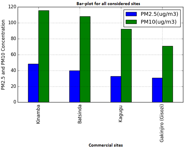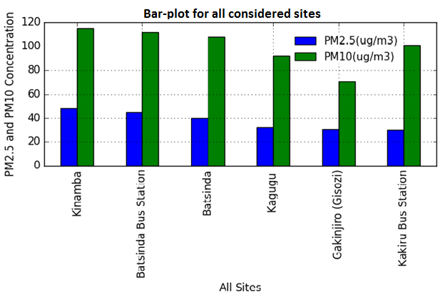 By considering all sites Figure 5, Measurements show that levels of Particulate Matter in Kinamba and Batsinda commercial centers, Kakiru and Batsinda Bus-station have the highest concentration levels while Kagugu and Gakinjiro (Gisozi) commercial centers have low levels compared to other sites.