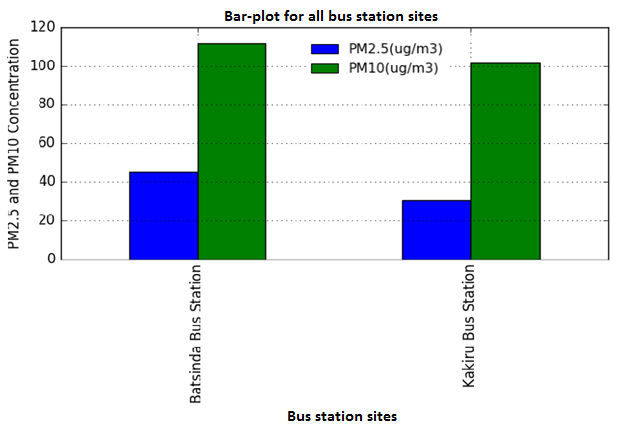 Figure-4. Levels of particulate matter for two bus-station areas considered (Batsinda and Kakiru) where Batsinda Bus station has high level of PM compared to that of Kakiru Bus stations.