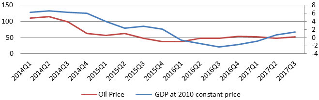 The increasing trend in Federal Government fiscal deficit occurred during the period of economic boom and economic recession. Specifically, Nigerian economy witnessed significant boom during increasing oil prices and recession during decreasing oil price because the Nigerian economy depend largely on crude oil receipt. From about $10 per barrel in 1999, the price of oil rose to $65 per barrel in 2006 and much further to about $142 per barrel in July 2008, before moderating significantly in the wake of the global economic and financial crisis to $45 per barrel in January 2009. Thereafter oil price picked up again and remained above $100 per barrel in June 2014 before the sudden and persistent decline from to June 2014. As could be seen from Figure 3, Nigeria’s output growth mimic’s movement in global crude oil price. The second half of the 2014 prior to the recession witnessed an episode of free fall in oil price reminiscent of late 2008. The increasing trend in Federal government fiscal deficit amidst increasing crude oil price and revenue raises three important policy questions such as, should government embark on fiscal deficit in times of economic boom and the likely implications of fiscal deficits for macroeconomic management.