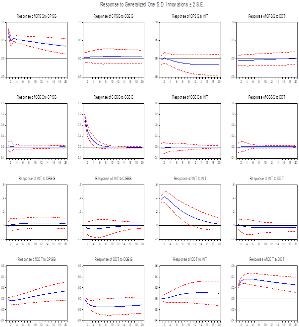 Credit to the government sector and that of domestic debt only accounted for 1.46 per cent and 1.59 per cent of variation in interest rate respectively. Panel (4) decomposes variations in domestic debt variable to other endogenous variables and itself. Besides itself (75.26 per cent), credit to government accounted for a large proportion of domestic debt variation (14.26 per cent). Credit to the private sector and interest rate accounted for paltry 4.61 per cent and 5.87 per cent respectively. Similarly, panel (2) indicates a significant role of Credit to the private sector in explaining Credit to the government sector.
