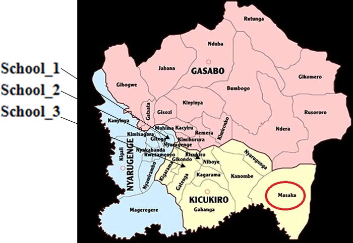 Kigali, the capital city of Rwanda is located at the center of the country geographically at latitude of 1o 57' South and longitude 30o04' East. This city presents a rapid population growth associated with an increase in infrastructures, industries, transport activities and economic activities. All the above mentioned aspects contribute to the increasing number of schools within Kigali city (Henninger, 2009; Henninger, 2013; Kumie et al., 2014).