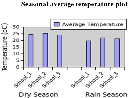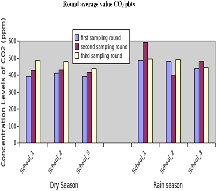 The Figure 3 depicts the results of the round-sampling of ambient air temperature by considering rain and dry season in all school. It indicates generally that the level of temperature for rainy season is law compared to that for dry season while Figure 4 illustrates the round-sampling for ambient CO2 concentration by considering rainy and dry season in all school. The figure indicates generally that the level of ambient CO2 concentration of the rainy season is high compared to that of dry season. Considering each school’s levels with respect to season we have the following discussion.