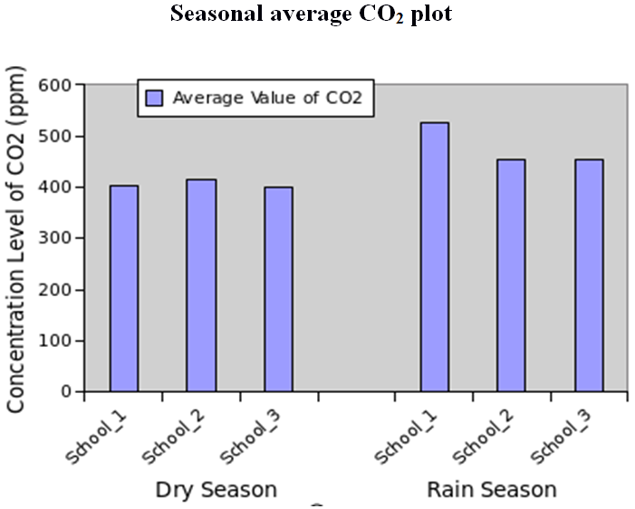 The results from sampling activities in school_1 show that in dry season the average levels of ambient air temperature and CO2 are 24.32oC and 403.89 ppm respectively while relative humidity is 63.956%. For rainy season the average levels of ambient air temperature and CO2 are 19.634oC and 526.533 ppm respectively and relative humidity is 79.20%. The results show that dry season is warmer than rainy season. The results indicate that dry season has a lower relative humidity compared to rainy season. CO2 concentration levels are higher during rainy season than during dry season.