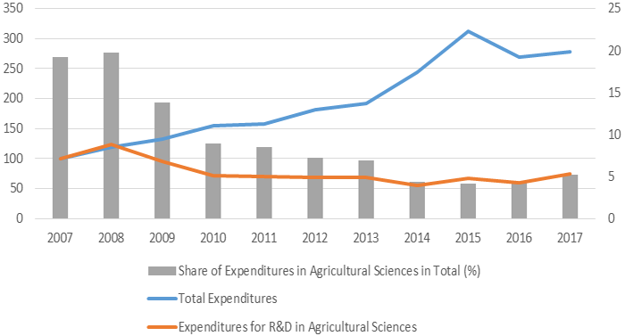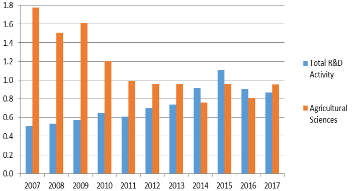 In the past years the expenditures for R&D activity in „Agricultural Sciences“ have diminished considerably both absolutely as well as a relative share in the total expenditures for R&D activity in the country Figure 1. While the overall amount of the expenditures for R&D activity has increased almost three times after 2007, the expenditures for R&D activity in „Agricultural Sciences“ have diminished with 45% until 2014, and demonstrate a growth afterwards reaching a three-quarters of the initial level in 2017.