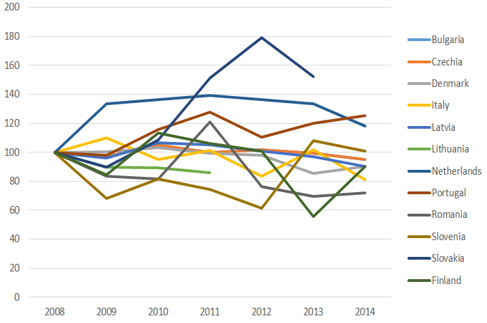 Figure-4. Evolution of intramural R&D expenditures in sector “Agriculture” in EU member states (2008=100).
