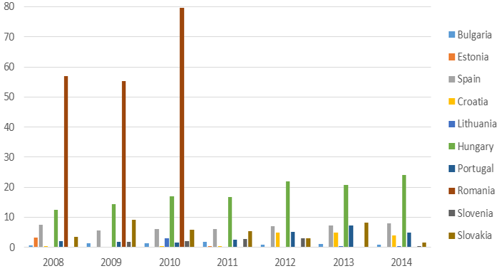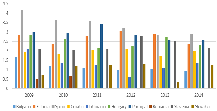 These trends in the evolution of agrarian R&D activity in Bulgaria are similar to other EU member states like Spain, Croatia, Slovakia and Lithuania, where it has been registered diminution of expenditures for R&D activity in agriculture in the last years Figure 4. At the same time in certain EU member states like Estonia, Hungary, Slovenia etc. there has been a significant growth in the overall expenditures for R&D activity in the sector.
