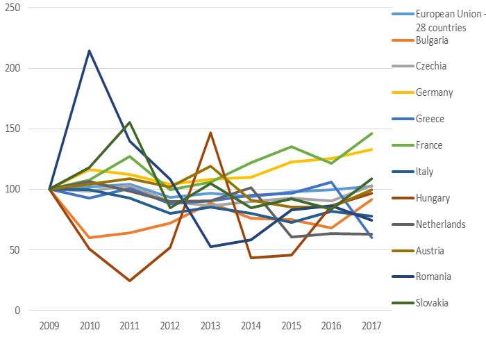 Figure-18. Evolution of government budget appropriations or outlays on R&D in agriculture in EU member States (2009=100).
