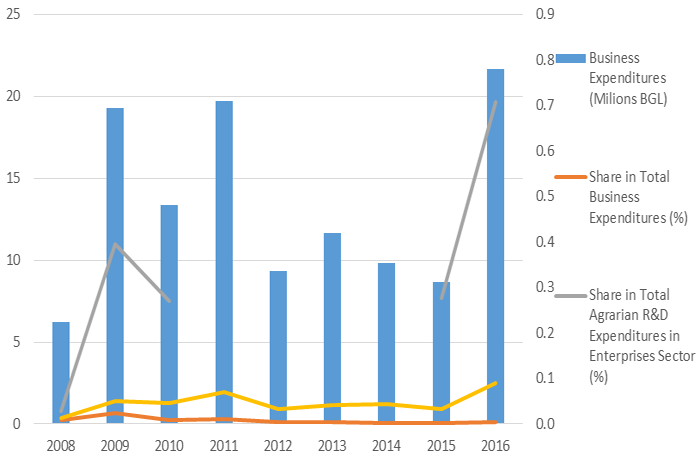 At the same time, the endowment with financial and material resources of employed in agrarian R&D activity in the private sector (Enterprises) is multiple times higher than in the public sector Figure 16. Expenditures for one employed in agrarian R&D activity in the private sector vary significantly in individual year as their level surpasses the average for the country from 5 (2016) to 21 folds (2008). All these expresses the significant lag in development of the governmental and university sectors in financing, payment of labor and modernization of R&D activity in Bulgarian agriculture in comparison with the business sector.