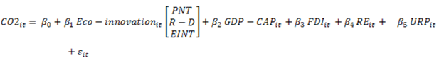 In the model, CO2 represents carbon emissions, PNT represent patents, R-D represents research and development expenditure, and EINT represents energy intensity; as proxies of eco-innovation. Also, GDP-CAP represents economic growth as gross domestic product per capita. FDI represents foreign direct investment inflows, RE represents renewable energy consumption, and URP represents urban population growth.