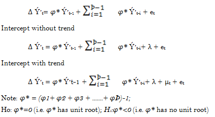 The check for stationarity is a sine-qua-non in time series analytics. For this purpose, we use the conventional ADF test which accommodates ARMA (p, q) models with unknown orders using the regression (Lawal & Aweda, 2015);