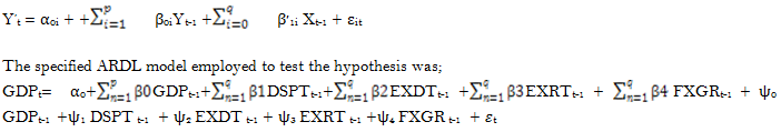 This model contains the dependent variable in its lagged form, the current variables and explanatory variables in its lagged form. It thus incorporates endogenous and exogenous variables. The ARDL model can be specified if all the proxies are Ї(1) or Ї(0) or cointegrated. The ARDL is more efficient when you have a small and finite sample data size. It also provides unbiased long run estimates (Adeleye, 2018).