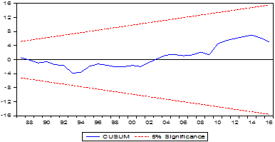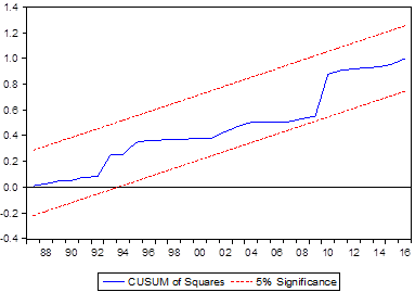 The RESET-F suggested that the model was specified in the correct form. The CUSUM plus the CUSUM of Squares figures suggested that the model was stable inside the lower and the upper bounds which indicated that the model was stable and correctly specified (see Figures 2 and 3). The Jarque-Bera normality test (P{JB Norm}>0.05) suggested that the residuals of the equation were normally distributed. The log-transformed data were done to improve linearity. The lagged variables were lagged-transformed to make the model robust. Therefore, the model was the Best Linear Unbiased Estimator (BLUE).