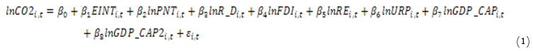 In Equation 1 lnCO2 represents the dependent variable which denotes carbon emissions per metric tonnes. EINT, lnPNT, and lnR_D are the independent variables that indicate energy intensity, patent applications registration, and research and development. lnFDI, lnRE, lnURP, lnGDP_CAP2, and lnGDP_CAP are the control variables: foreign direct investment, renewable energy consumption, urbanization, and gross domestic product per capita and its quadratic term, correspondingly. The proxies β1 to β8 stands for the parameter coefficients to be estimated, and β0 represents the slope coefficient to be estimated, and ε represents the error term or stochastic disturbance in the proposed model.