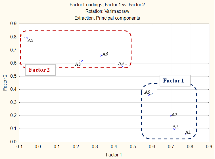 Figure 3. Component plot and rotated space of the exploratory two- factor solution.