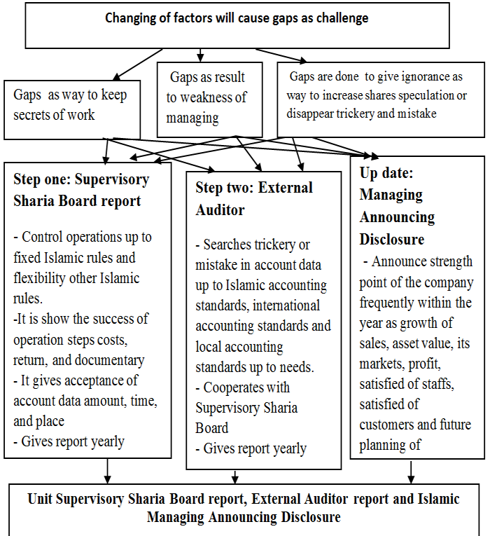 Daily Managing announcing report is way to build reputation. It shows expect company success for the future. Cooperation between Supervisory Sharia Board and external auditor must give suitable report show the currently success or weakness and show expect future success or weakness up to daily Managing announcing reports. The study model of gaps of financial analysis in Jordanian Islamic Banks is show in the next figure: