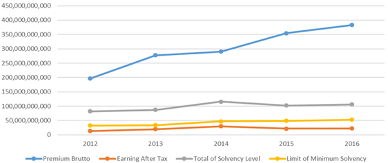Figure-3. The Trend of Sales, Earnings and Solvency 2012-2016. The Average og Gross Premium, Earning After Tax, Total of Solvency Level, Limit of Minimum Solvency.