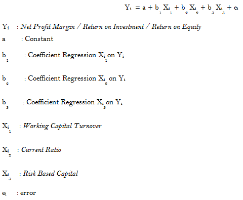 Type of research This research was carried out by using a quantitative research approach with causal designs that stated causal or influence relationships. The purpose of this study was to find out the profitability (net profit margin, return on investment and return on equity) as the dependent variable, which was stated as influenced by independent variables (working capital turnover, current ratio and risk based capital).